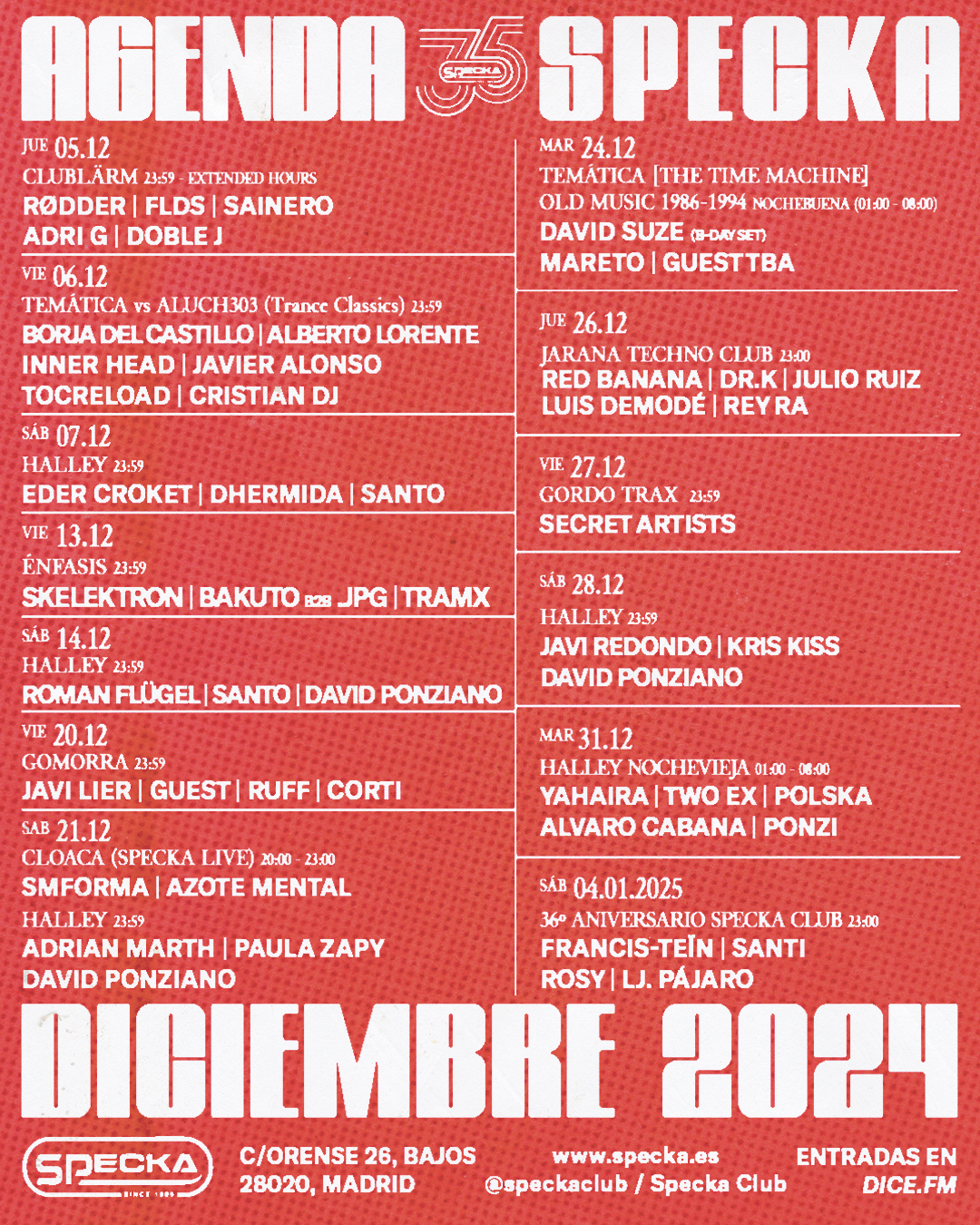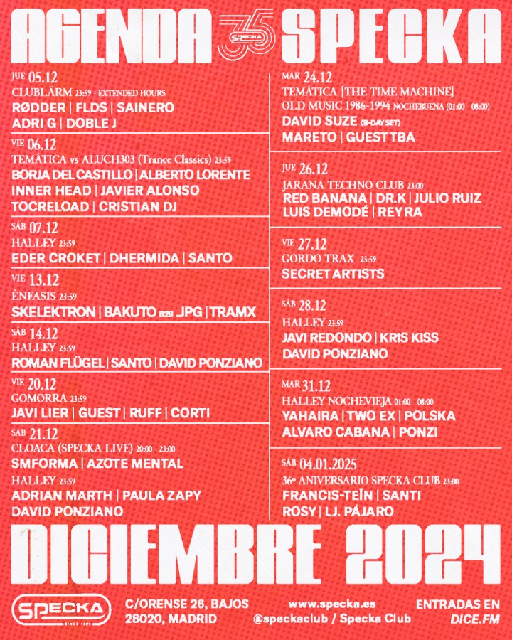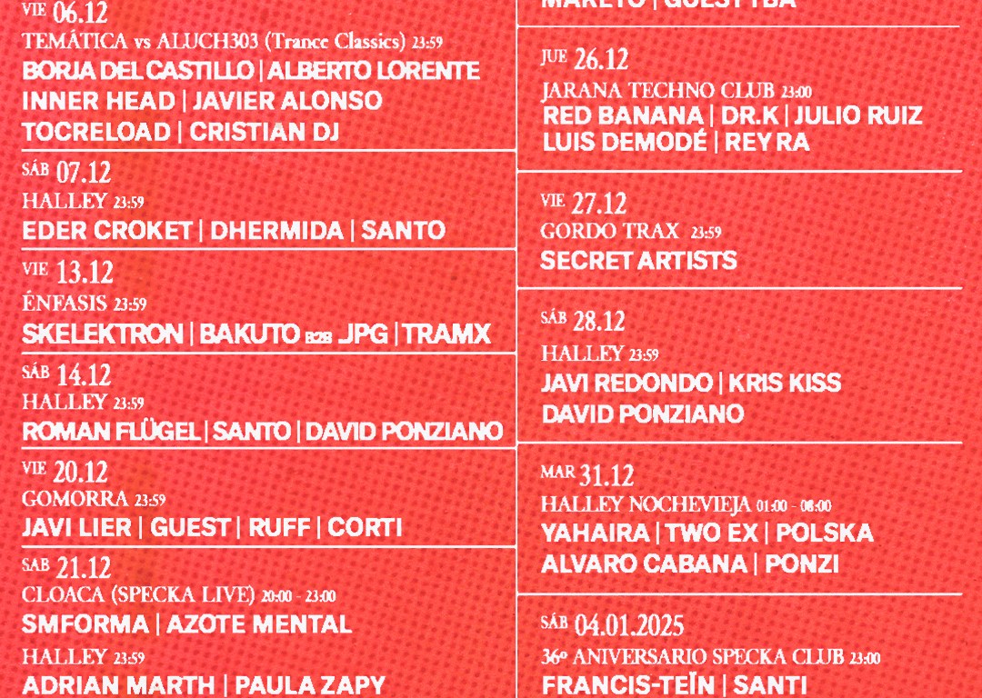 Esta segunda quincena de mes ofrece grandes sorpresas para los degustadores del mejor sonido electrónico. Las vistitas de gente como Roman Flügel, Javi Lier o Adrian Marth, la nuevas citas de Halley y Gordo Trax, así como la celebración de Nochevieja culminarán el sábado 4 de enero con el 36º Aniversario de Specka, siendo una fecha muy señalada para celebrar, brindar por el 2025 así como por el club madrileño.
