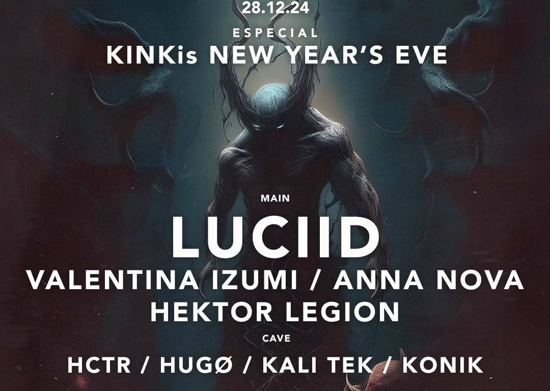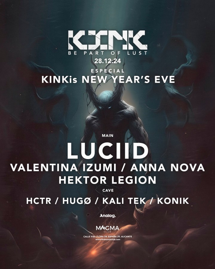 El próximo 28 de diciembre KINK Social Club celebrará su particular Nochevieja en la Sala Magma. Encabezará el line up el irlandés Luciid, un artista que ha pasado de ser estrella emergente del techno más duro, a una realidad más que tangible. Le acompañarán en la cabina de la Main Valentina Izumi, Anna Nova y Hektor Legion, mientras que en el espacio Cave los protagonistas serán HCTR, Hugø, Kali Tek y Konik. Puedes conseguir tu entrada aquí.