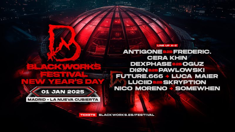 Energía. Festividad. Contundencia. Buen ambiente. Y Hard-Techno; mucho Hard-Techno. BLACKWORKS FESTIVAL NEW YEAR’S DAY permitirá a los aficionados de MADRID empezar el año a lo grande gracias a un evento rompedor donde se juntarán artistas muy punteros del momento para hacer estallar las mentes de los aficionados en base a metralla musical y ritmos desenfrenados.