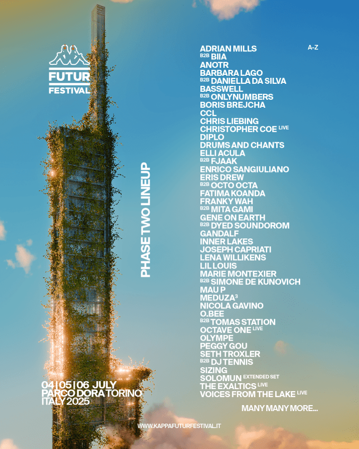 Kappa Futurfestival, festival referente de la escena electrónica y las artes digitales en Europa, continúa dando forma al line up de la 12º edición del festival en la capital piamontesa con su segundo avance de programación. Una segunda fase de avance de line up incorpora casi cincuenta nombres distribuidos en treinta y cuatro shows que se añaden al cartel, completado casi 90 shows para esta nueva edición, desde el viernes 4 al domingo 6 de julio de 2025 en el recinto post-industrial de Parco Dora de la ciudad, tras batir todos los récords en su sus pasadas ediciones, llegando a casi 200 nacionalidades diferentes entre los asistentes.