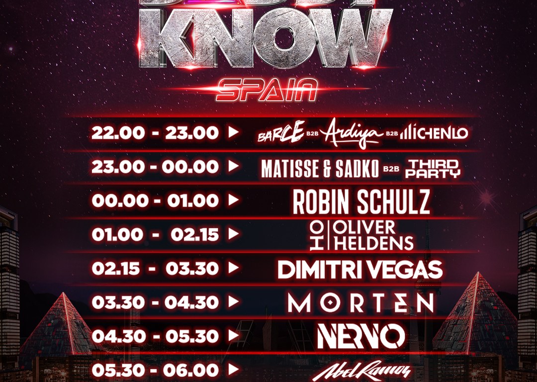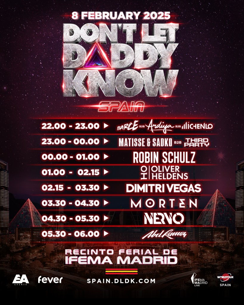 Tras presentar entre vítores su regreso a España y, concretamente, a Madrid, el festival DON’T LET DADDY KNOW ya cuenta con horarios de actuaciones para esta nueva gran cita con el EDM en la capital. El sábado 8 de febrero los aficionados podrán disfrutar en IFEMA de géneros como el EDM, Big Room, House, Future Rave, Progressive House, Future House y otros subgéneros gracias a un variado cartel que cuenta entre sus mayores estrellas con Dimitri Vegas, Oliver Heldens, Matisse & Sadko b2b Third Party, Robin Schulz o MORTEN entre otros.