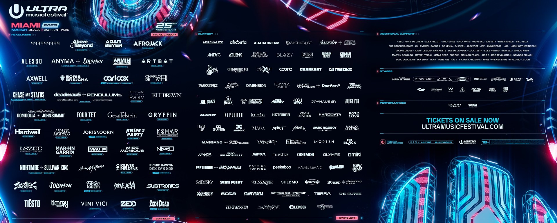 El cartel de uno de los mejores festivales de música de todo el mundo sigue creciendo de cara a su cada vez más cercana nueva edición. ULTRA MIAMI siegue expandiendo la propuesta musical de su 25º Aniversario, fecha en la que quieren batir todos los récords presentando una de las apuestas artísticas más variadas, completas y poderosas de su historia. Con varios pelotazos finales y completando el elenco de todos sus escenarios, todo queda listo para encarar la recta final previa a la irrupción de la música en ULTRA.