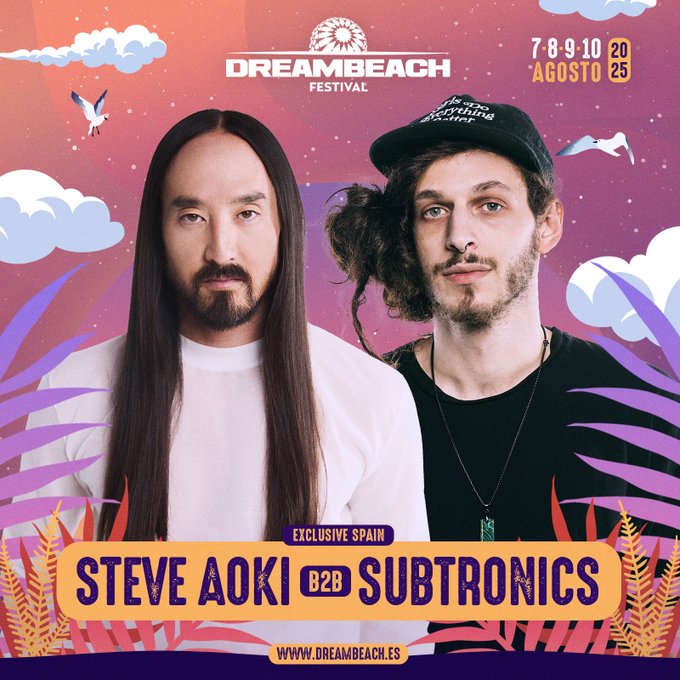Los estadounidenses STEVE AOKI y SUBTRONICS se encargarán de unir fuerzas en el B2B más loco de Dreambeach 2025. La música Bass será el vaso comunicante entre el referente del EDM y el de Dubstep, quienes harán que el Mainstage vibre al son que marquen dos artistas a priori muy diferentes musicalmente, pero que asumen el reto de sorprender y dejar el listón muy alto. Además, Aoki se ha mostrado siempre muy abierto a incluir y apostar por sonidos diversos, lo cuál sumado a su locura habitual en vivo y al talento de Subtronic (y su debut en España) suman más alicientes de cara a este show.