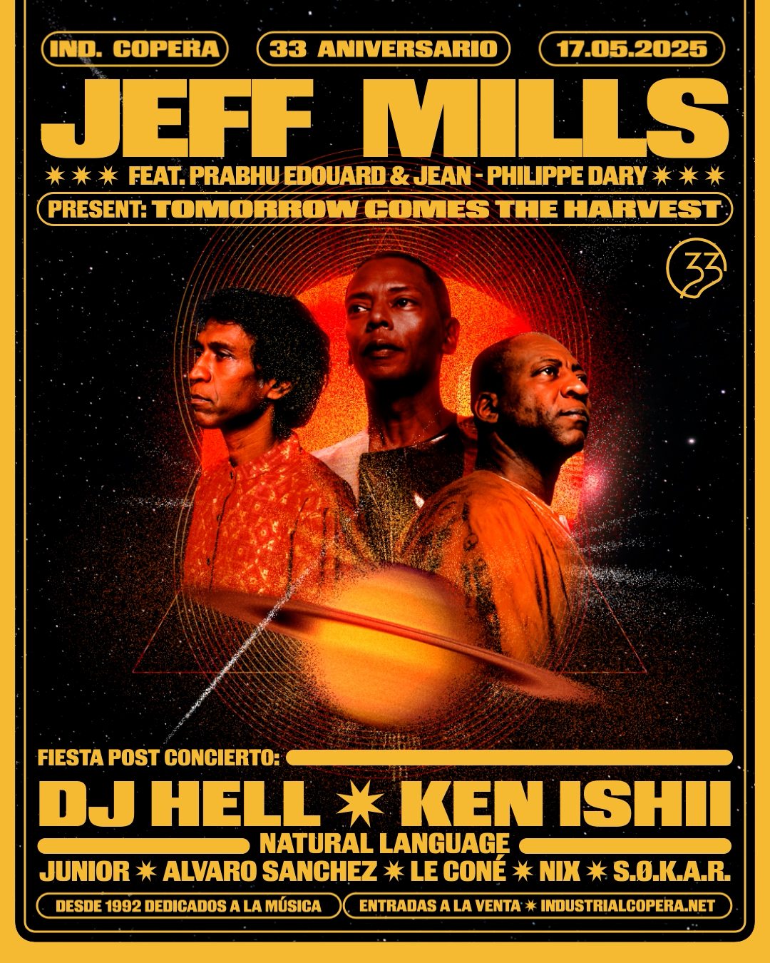Ya queda muy poco para celebrar el 33 aniversario de Industrial Copera, y que mejor forma de hacerlo que un festival de 12 horas de duración en el que tendremos de asistir a un concierto extraordinario: Tomorrow Comes The Harvest, con Jeff Mills, Prabhu Eduoard y Jean Philippe Dary. La cita será el 17 de mayo y además de este hito musical también podremos deleitarnos con los sets de DJ Hell, Ken Ishii, Junior, Álvaro Sánchez, Le Coné, Nix y S.O.K.A.R.