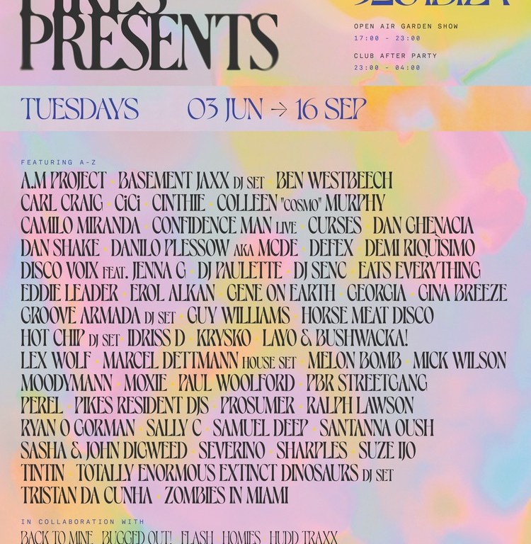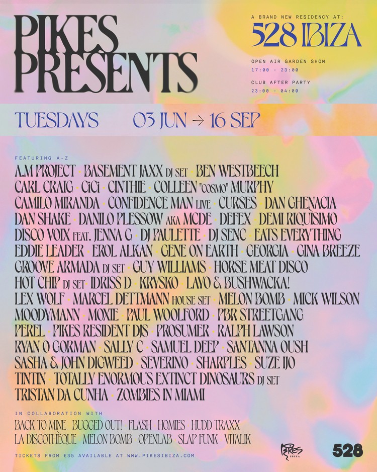PIKES PRESENTS… 528 IBIZA A-Z LINE UP: Dinosaurs (DJ Set), Basement Jaxx (DJ Set), Carl Craig; Chez Damier; Colleen “Cosmo” Murphy; Confidence Man (live); Dan Ghenacia; Dan Shake B2B Demi Riquìsimo; Danilo Plessow aka MCDE; Eats Everything B2B Horse Marcel Dettmann (house set), Meat Disco; Groove Armada (DJ Set), Hot Chip (DJ Set); Layo & Bushwacka!, Luke Una, Moodymann, Ogazon, Paul Woolford, Ron Trent, Sally C, Sasha & John Digweed, Totally Enormous Extinct y más que serán anunciados próximamente.