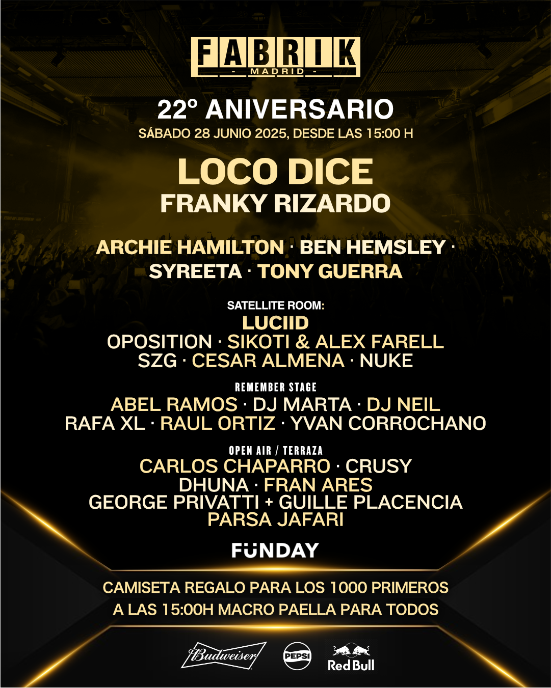 A partir de ahí, podremos perdernos por el colosal recinto de FABRIK para bailar con alguno de los headliners de este aniversario, tales como Loco Dice, Franky Rizardo (Music On), Archie Hamilton, Ben Hemsley (debut en FABRIK) o Syreeta (debut en FABRIK). Mientras, en la Satélite tendremos el espacio dedicado para los amantes del hard techno más actual, con Oposition o Luciid, y en la nueva Crystal en formato 360º los que buscan sonido remember con la vuelta de Dj Marta, invitados como Neil o Abel Ramos, y por supuesto, Raúl Ortiz.