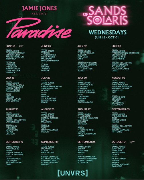 Ya queda muy poco para el comienzo de la fiesta que promete romper todos los récords en Ibiza. Hablamos de Paradise de Jamie Jones, el evento con más buen rollo de la isla y que comenzará una nueva andadura en [UNVRS]. Paradise es sinónimo de empatía, de buenas vibraciones y como no podía ser de otra forma de una calidad musical de primer nivel. Si quieres saber quién y cuándo actuarán en Paradise no dejes de leer este artículo: