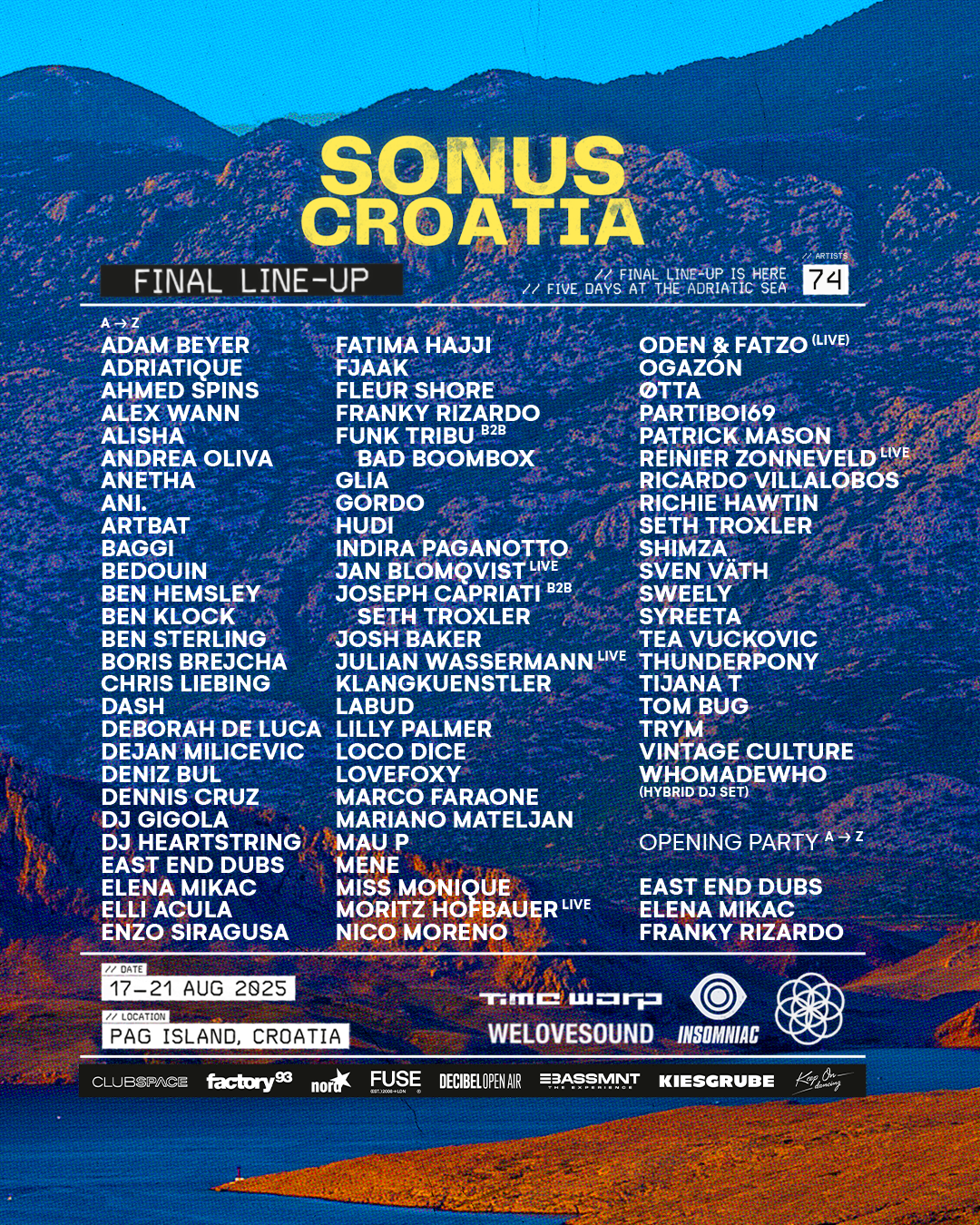 Los socios de la marca también han subido de nivel, contando en esta edición con un colaborador nacional, el club madrileño The Bassement y otros agentes de la escena internacional como Decibel Open Air de Italia, el grupo de fiestas Kiesgrube de Düsseldorf y los favoritos de Ibiza Keep On Dancing como anfitriones, uniéndose a los previamente anunciados Space Miami, Factory 93 de Los Ángeles, FUSE de Londres y Nordstern para una serie de tomas de escenario. Todo esto se suma a la ecléctica lista de cabezas de cartel que Sonus Croacia 2025 ya había confirmado: Adam Beyer, Anetha, ARTBAT, Ben Klock, Boris Brejcha, Deborah De Luca, DJ HEARTSTRING, Indira Paganotto, Joseph Capriati b2b Seth Troxler, Miss Monique, Reinier Zonneveld live, Ricardo Villalobos, Richie Hawtin, Sven Väth y muchos más.