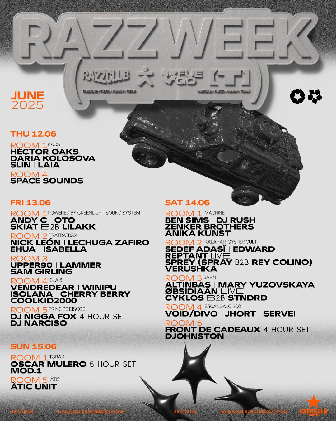 Los días del 12 al 15 de junio Razzmatazz se llama Razz Week. Cuatro noches consecutivas en las que RAZZCLUB mostrará su potencial al completo combinando dos pilares fundamentales que han definido la oferta musical del histórico club situado en Barcelona. Por un lado, una programación internacional de primer nivel que no deja de jugar con el riesgo y la vanguardia; y por otro, la representación y la apuesta por el talento y la comunidad local. La mezcla de estos dos factores, cada uno en su justa proporción, aseguran un tipo de experiencia de club comprometida, especial y singular.