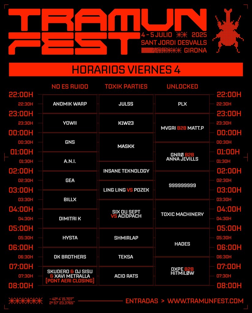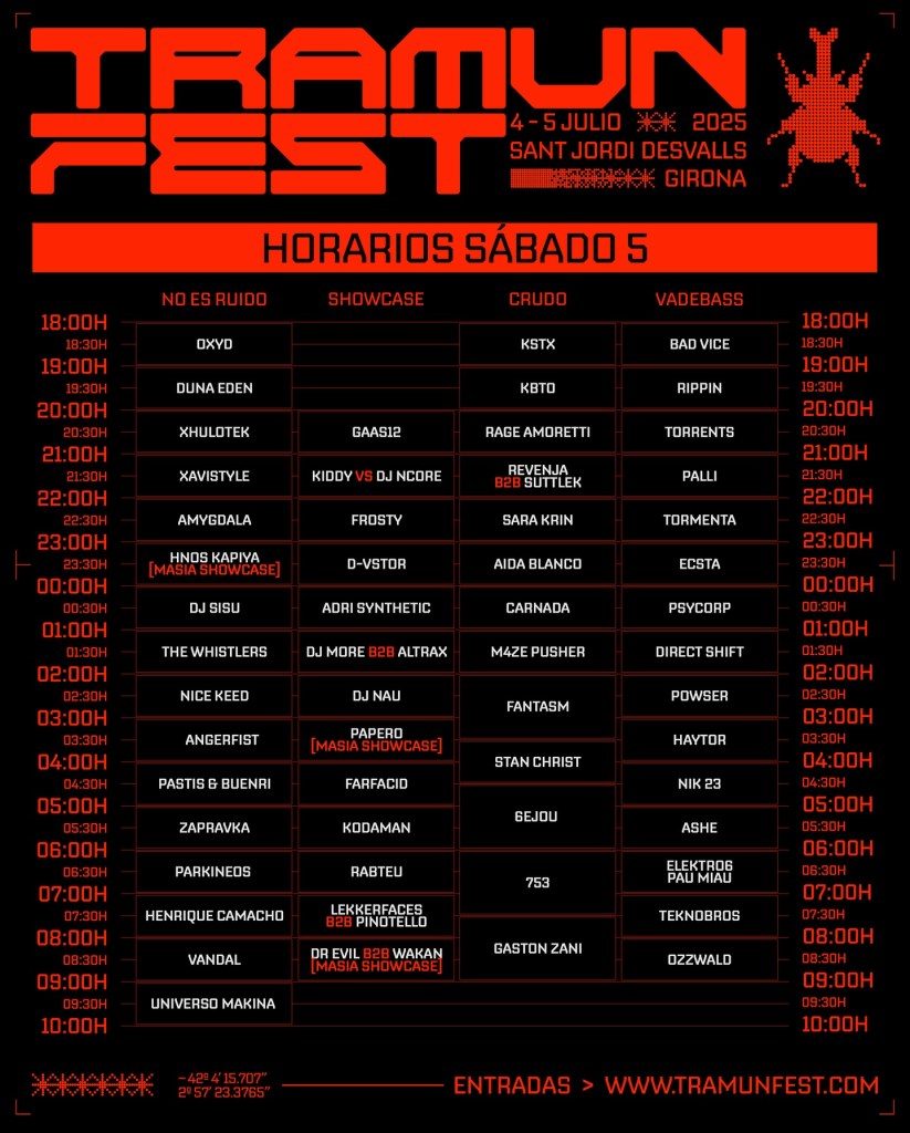 Cataluña ya se prepara para dar rienda suelta a la electrónica más poderosa. Los mejores sonidos del HARD se dan cita este fin de semana (4 y 5 de Julio) en TRAMUNFEST, festival con gran recorrido en el área norte peninsular y que reunirá en San Jordi Desválls (Gerona) a un selecto grupo de artistas que durante dos intensas jornadas musicales ofrecerán altos ritmos electrónicos y mucha guerra sonora.