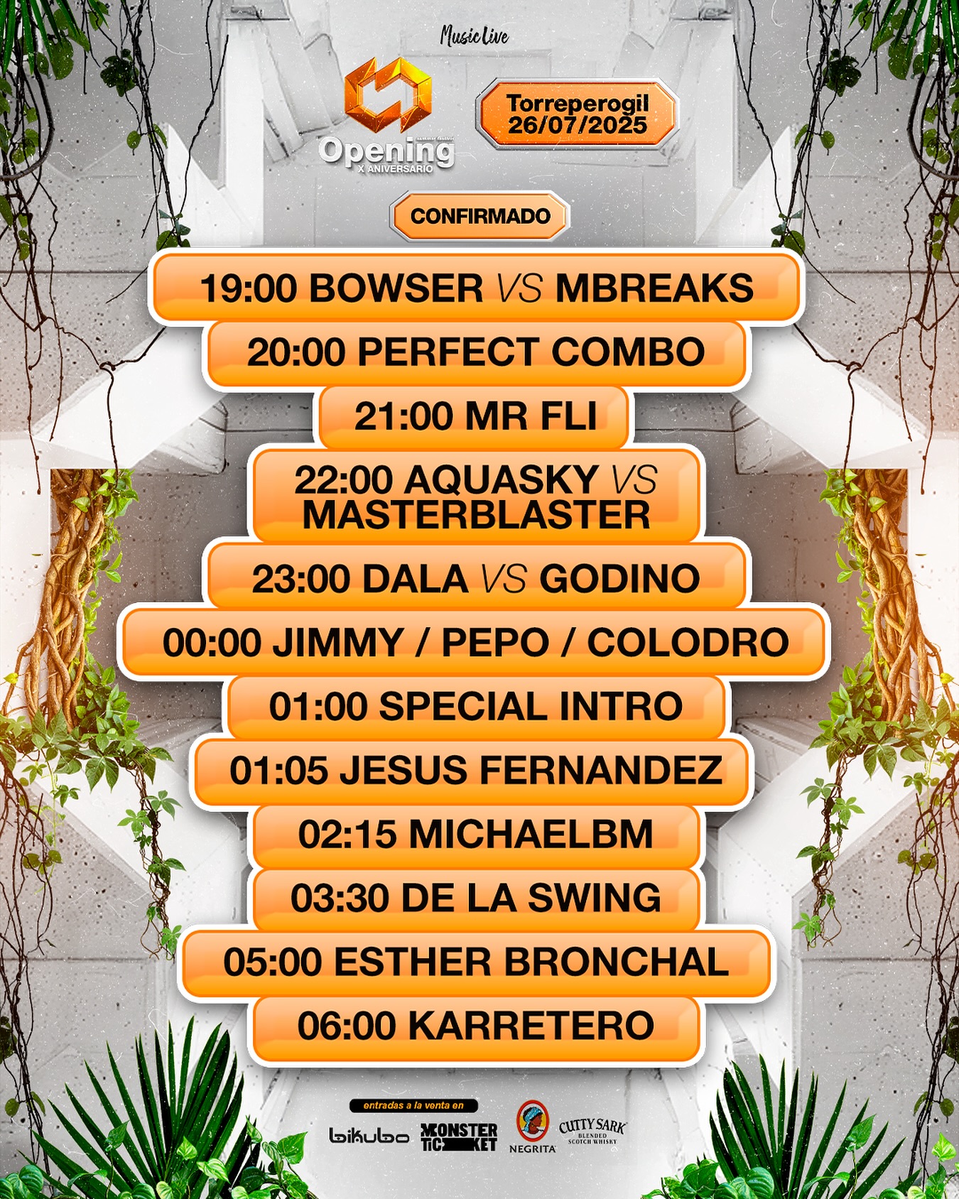 LineUp: Michael BM, Aquasky vs Masterblaster, De La Swing, Mr Fli, Bowser, Ester Bronchal, Perfect Kombo, Jesús Fernández, Karretero, MBreaks, Jimmy b2b Diego López, Colodro, Godino b2b Dala