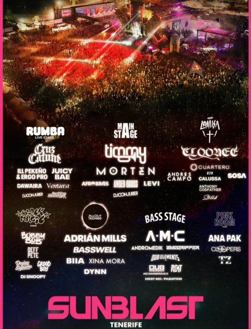 Uno de los clásicos del verano español es el festival canario SUNBLAST. El evento celebrado en Tenerife volverá a reunir el próximo sábado 9 de agosto a un selecto, variado y puntero grupos de artistas que harán las delicias del público a lo largo y ancho de 7 escenarios simultáneos situados en su recinto habitual Costa Adeje, en el Sur de la isla de Tenerife.