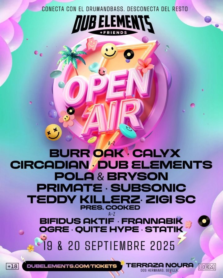 DUB ELEMENTS siguen ‘liándola’ trayendo a España a los grandes referentes Drum & Bass del momento. El dúo sevillano ha completado el cartel de su próxima cita Open Air, la cual asaltará la Terraza Noura del Hipódromo de Dos Hermanas (Sevilla) con un cartelazo lleno de grandes artistas que se citarán los días 19 y 20 de septiembre para combinar esencias muy variadas bajo un mismo sino: el buen rollo y el talento.
