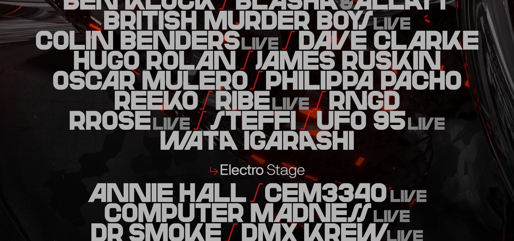 El cartel incide en la apuesta por la calidad y el talento incuestionable. Destaca la presencia de Ben Klock, el arquitecto venerado del techno berlinés, Óscar Mulero, el referente electrónico más respetado de nuestro país, y Dave Clarke,que se ha ganado a pulso el sobrenombre de “The Baron of Techno”. No te puedes perder a James Ruskin, el británico aporta una disonancia dosificada entre las cualidades del techno vintage y las capacidades y arreglos actuales, Blasha & Allatt, un dúo con una energía simbiótica detrás de los platos, Philippa Pacho, una promesa convertida en realidad curtida en las raves ilegales de Estocolmo, Wata Igarashi, que ha desarrollado un estilo eufórico psicodélico con estructuras cristalinas, Reeko, que ha demostrado una y otra vez ser un verdadero maestro de las producciones más oscuras y contundentes y Steffi, una artista que no hace las cosas a medias y cuya actitud le ha mantenido a la vanguardia de la música de baile contemporánea.