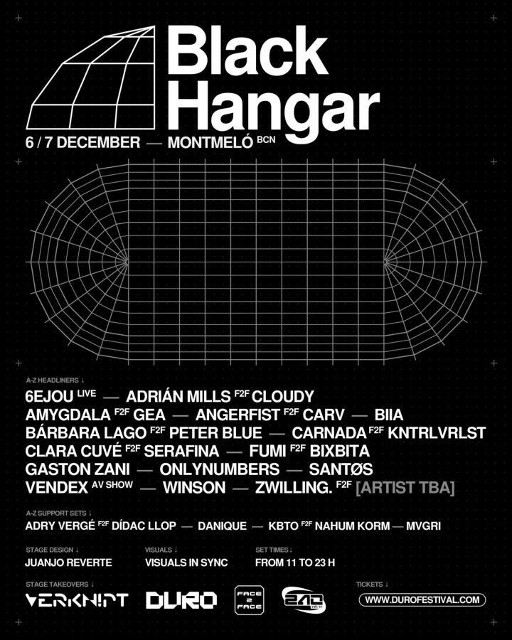 Con un horario de actuaciones de 11:00 a 23:00 en las dos jornadas, Black Hangar se postula desde ya como uno de los mejores festivales del cierre de 2025 en España. La contundencia se abrirá paso de la mano de un talento pujante a nivel mundial, dando soporte a diferentes subgéneros y aromas dentro del Hard y del Techno. En esa variada y acertada propuesta musical, no faltará la respuesta de un público fiel que ve como sus deseos de fiesta son correspondidos de forma original, con apuestas innovadoras y con la alianza de Duro junto a marcas que están en la cresta de la ola. ¡Os dejamos el LineUp al completo!: