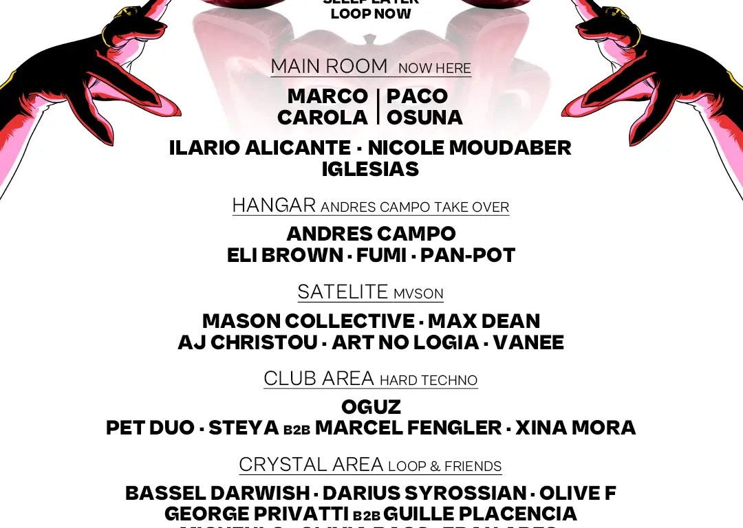 El sonido House y Tech-House tendrá su propio espacio gracias a MASON COLLECTIVE, quienes inundarán de buen rollo la Satelite con su marca MVSON. El magnífico trío estará muy bien respaldado por otros artistas como MAX DEAN, AJ CHRISTOU, ART NO LOGIA y VANEE. Estos sonidos (con arreglos Deep, Garage y House) se extenderán también en la Crystal Área, donde Loop asentará su piso franco de la mano de djs amigos como DARIUS SYROSSIAN, OLIVE F, GOERGE PRIVATTI B2B GUILLE PLACENCIA, MICHENLO, OLIVIA BASS y FRAN ARÉS. La contundencia y la exuberancia se citarán en CLUB ÁREA para hacer que el Hard Techno también tenga presencia en esta importante cita. Con el frenetismo del neerlandés OGUZ al frente y el sonido arrollador del Schranz de PET DUO, esta sala contará también con el B2B de STEYA y MARCEL FENGLER y la energía de XINA MORA.
