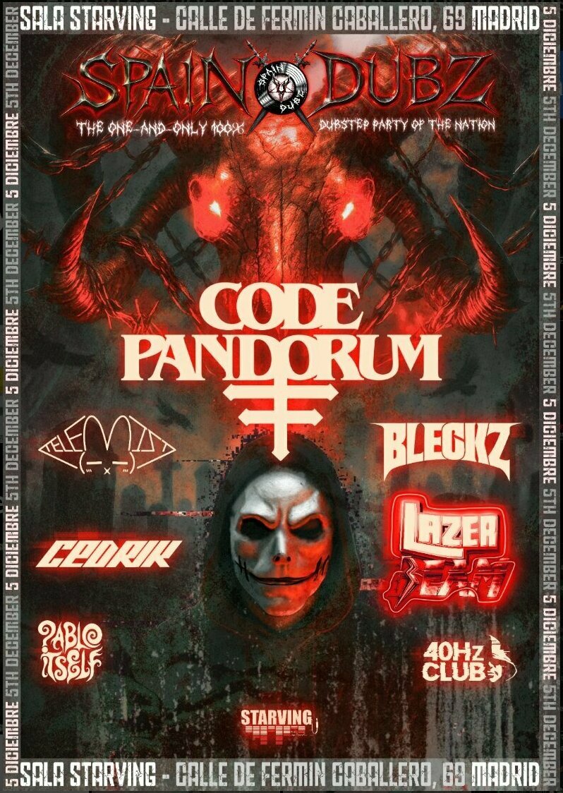 El alemán CODE:PANDORUM será el gran protagonista de esta fabulosa y entrañable cita. Programada para el viernes 5 de Diciembre en la Sala Starving de Madrid (Cerca de la Vaguada, en el Pilar), esta fiesta ofrecerá el debut en exclusiva en España del referente Bass. Con una trayectoria impecable que le ha puesto en el panorama internacional como uno de los productores más destacados de toda Europa, el capo de Crowsnest Audio se caracteriza por liderar el Deathstep: un sonido brutal, arrollador y en el que se combina la agresividad con capas y atmósferas orquestales de gran oscuridad.