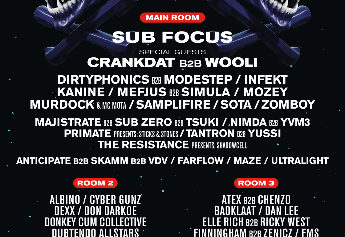 El gran headliner D&B para la ocasión será el británico SUB FOCUS. Con su nuevo álbum Contact recién salido del horno, el líder de Worship justificará su posición de GOAT del Dancefloor con una actuación donde no faltarán los temas más icónicos de su carrera, así como el listado del citado disco. Por parte del Dubstep, el protagonismo recaerá en la fantástica unión entre CRANKDAT y WOOLI, quienes con un enérgico B2B desatarán un incesante headbanging entre los aficionados. Otras curiosas uniones como las de MEFJUS y SIMULA en clave Neuro-Roller-Deep; y DIRTYPHONICS y MODESTEP en una fantástica fusión de Dubstep y DnB, serán otros de los grandes atractivos de un festival que sabe bien como fichar para contentar a sus aficionados.