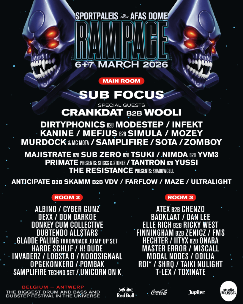 El festival belga RAMPAGE ya tiene cartel completo para su próxima gran cita. El denominado como ‘mayor festival de Drum & Bass y Dubstep del Universo’ vuelve a la acción con su Rampage Weekend, un evento que tendrá lugar los días 6 y 7 de Marzo en Antwerp (Bélgica) y que reunirá a sus fieles europeos entorno a varios de los grandes referentes del momento de la escena Bass mundial, quienes dan forma a una programación de 3 escenarios simultáneos donde destacan la variedad y la calidad.