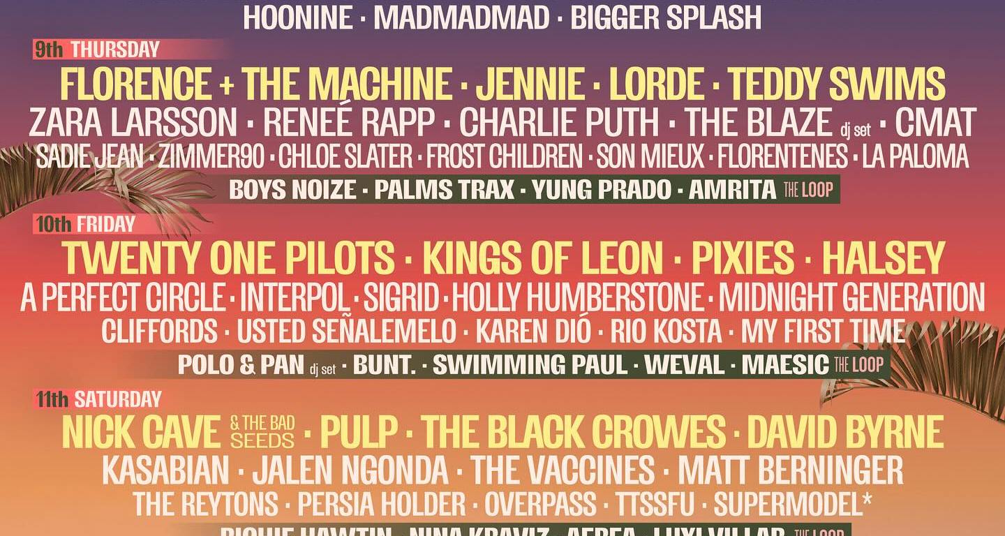 Grandes bandas y cantantes como FOO FIGHTERS, TWENTY ONE PILOTS, KINGS OF LEON, WOLF ALICE, FLORENCE + THE MACHINE, PIXIES, HALSEY, PULP, THE WAR ON DRUGS o CHARLIE PUTH lideran el LineUp ofreciendo un híbrido de aromas clásicos y contemporáneos que fluirán entre secuencias Rock, Pop, Punk y ritmos alternativos. Con un acercamiento al sonido electrónico encontramos a JENNIE, estrella surcoreana del K-Pop y miembro de Blackpink; la neozelandesa LORDE y la irlandesa CMAT con un Pop-Electrónico Alternativo; o la sueca ZARA LARSSON, con un Pop electrónico que le ha llevado a colaborar con David Guetta, Kygo, Alok o Clean Bandit entre otros. Un pionero de la electrónica como MOBY será otra de las mayores estrellas del festival. El estadounidense regresa a España para demostrar por qué es uno de los iconos de la escena Dance y Ambient. Con un aroma más reposado estarán los franceses THE BLAZE, percutiendo en ritmos House, Ambient e Indie.