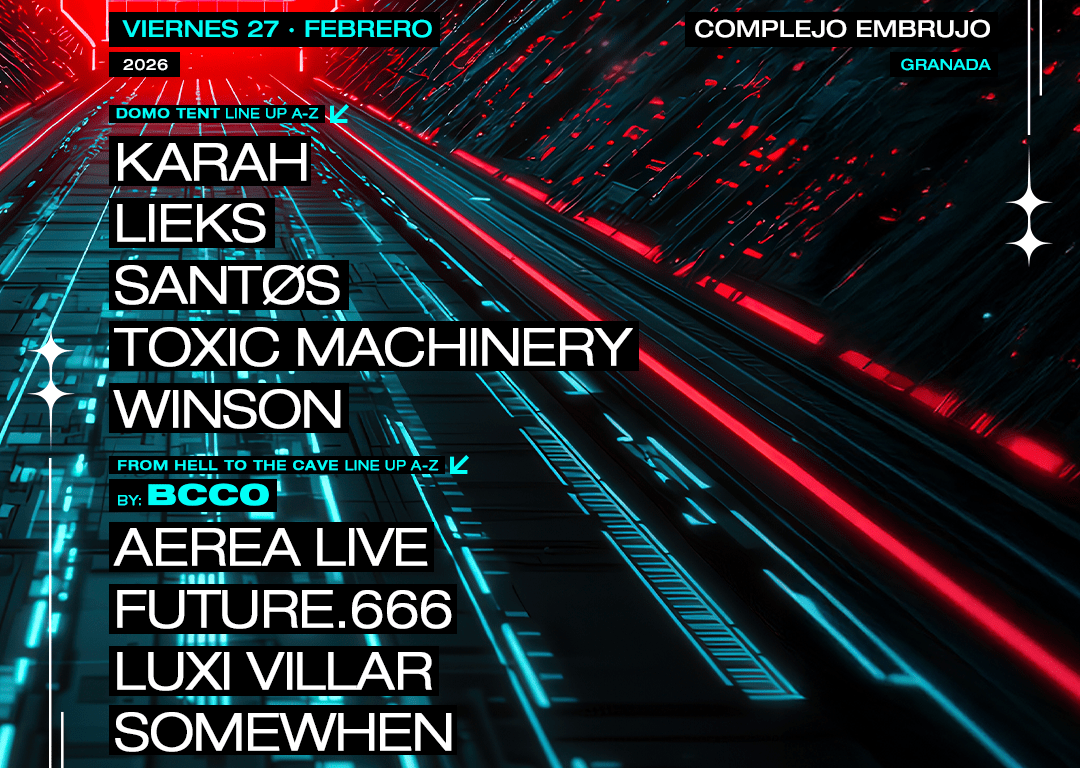 El cartel incluye dos espacios: en la DOMO Tent estarán Karah, Lieks, Santos, Toxic Machinery y Winson; mientras que en el Área Live tocarán Aerea Live, Future.666, Luxi Villar, Somewhen y Ueberrest. La fiesta comienza a las 21:00 y durará hasta las 7 de la mañana, ideal para quienes quieren bailar toda la noche y sumergirse en una experiencia única.