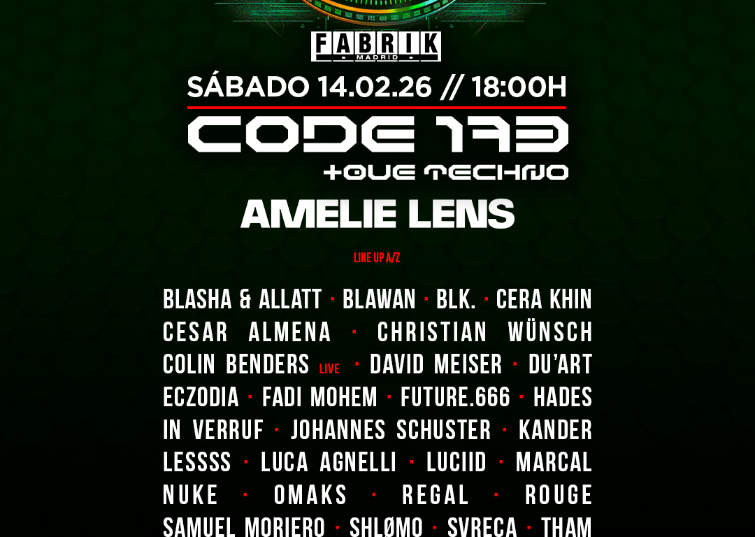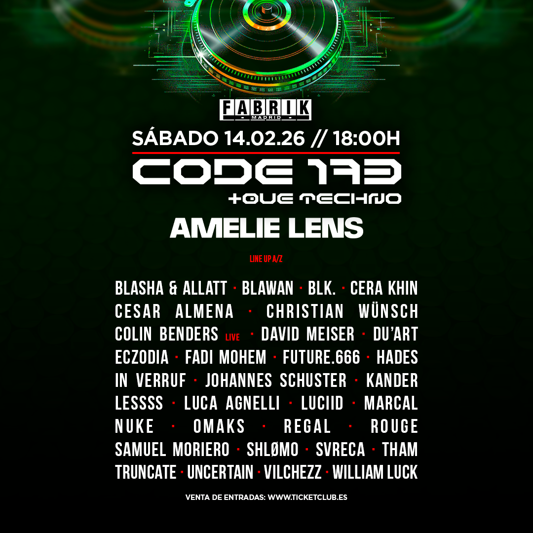 Esta fecha viene señalada por la vuelta a FABRIK de la belga Amelie Lens, casi tres años después de su última visita al macroclub madrileño, en la CODE 152 del 23 de marzo de 2023. La cabeza de Exhale es uno de los nombres imprescindibles de la electrónica actual y su presencia en CODE siempre tiene un peso especial. La Main Room se completa con el nacional Regal, referente de sets enérgicos desde su visión techno; el alemán Future.666, que debutará en la sala principal con una selección cargada de groove; el inglés Blawan, uno de los productores más respetados del circuito, y el cierre de los residentes Nuke y César Almena.