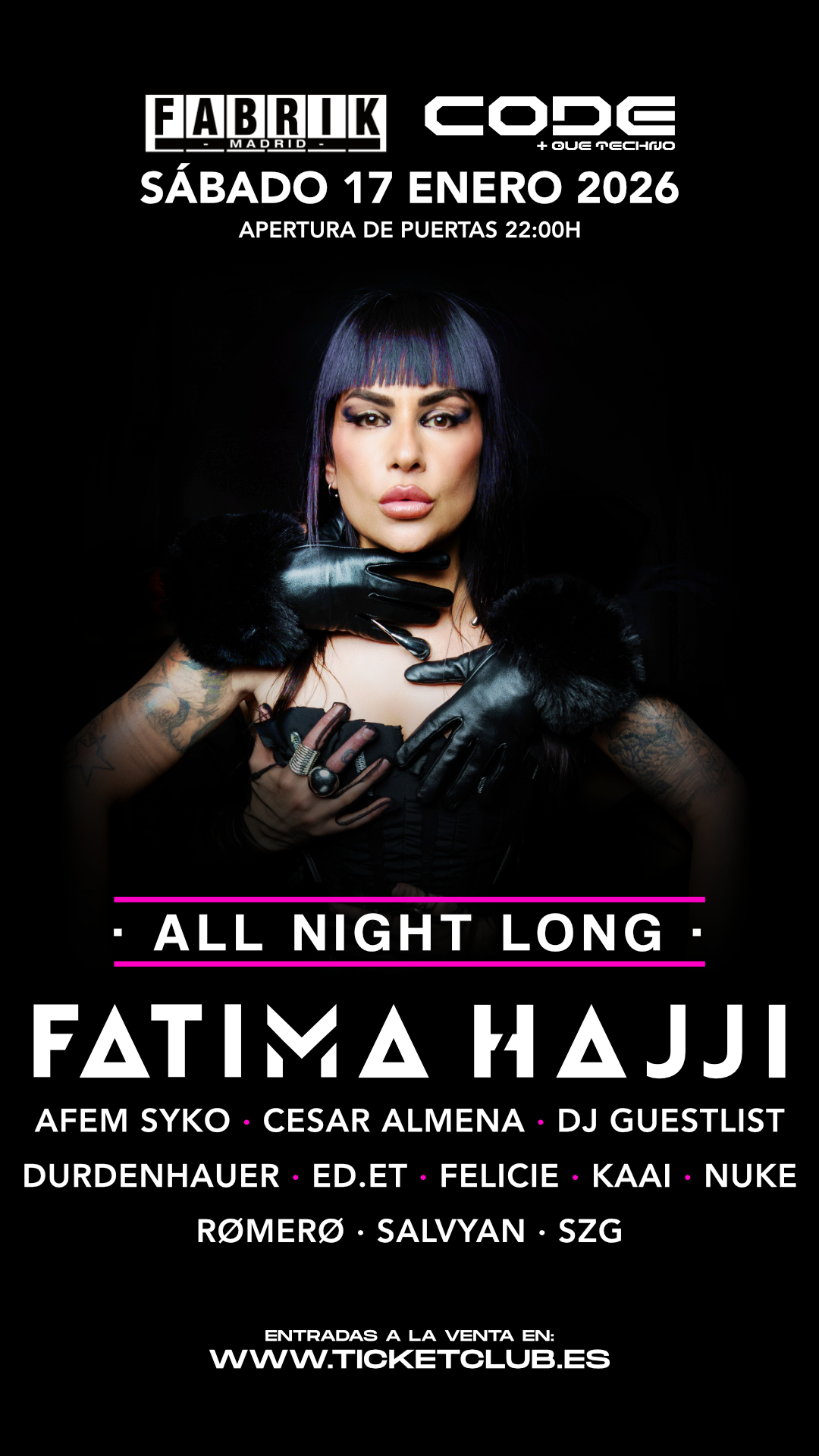 La cuarta edición de la fecha especial All Night Long de FATIMA HAJJI en FABRIK comienza su cuenta atrás. El sábado 17 de enero Hajji inaugura 2026 con esta sesión exclusiva, que por cuarto año consecutivo la convertirá en protagonista de la Main Room del templo madrileño. Una cita que se completa con Crystal Room y Club Área, que ya presentan line up completo, donde además de Hajji destacan varios nombres internacionales de la escena Hardtechno.