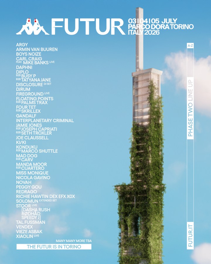 Kappa FuturFestival confía también en nombres que tienen fuerza por sí solos que se incorporan al line up, en una confluencia de estilos como Boys Noize, Joe Claussell, KI/KI, Miss Monique o Vendex. La segunda fase del line up de 2026 se completa con artistas como Argy, Daphni, DjRUM, Gandalf, Interplanetary Criminal, Nicola Gavino, NOVAH, Redrago, Tal Fussman o Vieze Asbak, o shows en directo como Fireground LIVE y Xiaolin LIVE. El espacio Parco Dora de Turín será el escenario donde irán desfilando más de un centenar de artistas durante tres jornadas consecutivas, donde la electrónica será protagonista, además de otros espacios de la ciudad, como las localizaciones de las opening parties en la jornada del jueves 2 de julio, punto de comienzo oficial de Kappa FuturFestival o el atractivo programa Art & Techno para esta nueva edición.
