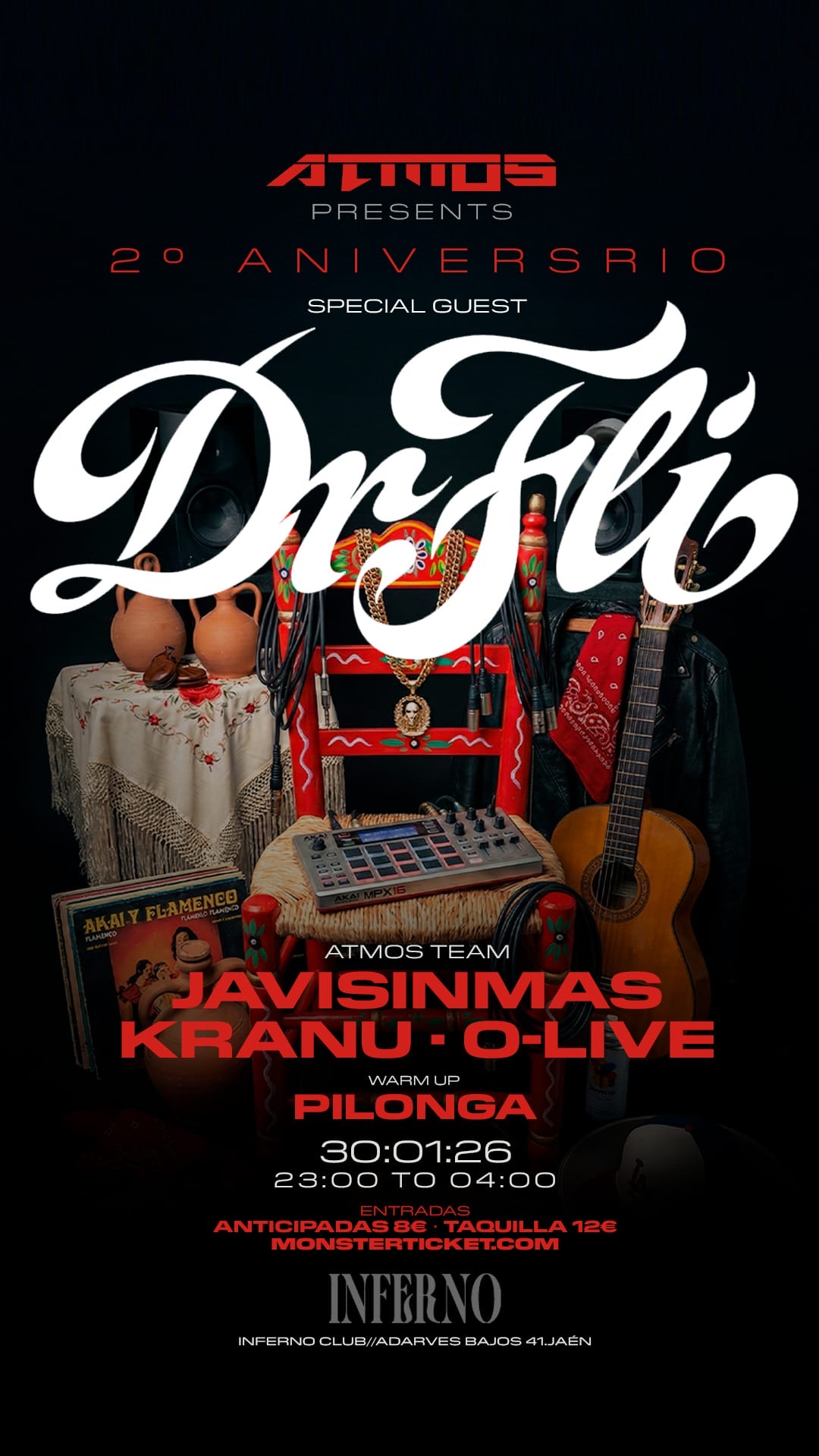 DR FLI y su particular propuesta sonora serán los actores principales de una jornada que se presenta algo diferente pero igual de intensa en Atmos. Con los aromas más alternativos bajo un toque y sello creativo distinto, el de Granada llegará para ofrecer un show variopinto que no deja indiferente donde combina ritmos rotos y secuencias electrónicas con referencias que van desde el Hip Hop hasta el flamenco pasando por tintes Latinos. Junto a él estarán los 3 protagonistas de ATMOS, JAVISINMAS, KRANU y O-LIVE, quienes a base de Drum & Bass y Breakbeat harán saltar y enloquecer a su fiel público. PILONGA, a modo de Warm Up, completa el cartel de la velada.
