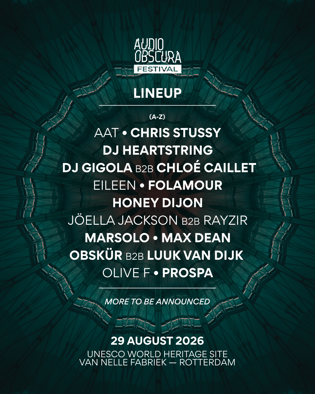 El productor de eventos electrónicos pionero y rompedor Audio Obscura anuncia el regreso de su festival insignia, Audio Obscura Festival, en el sitio Patrimonio Mundial de la UNESCO Van Nelle Factory en Róterdam el sábado 29 de agosto de 2026. Tras el rotundo sold out de su primera edición en 2024, este showcase único y al aire libre regresa en 2026, marcando un nuevo capítulo en el desarrollo de Audio Obscura como una plataforma cultural verdaderamente singular. El festival ha anunciado a los primeros artistas confirmados, un batallón electrónico formado por Chris Stussy, DJ Gigola b2b Chloé Caillet, DJ Heartstring, Eileen, Folamour, Honey Dijon, Jöella Jackson b2b Rayzir, Max Dean, Marsolo, Obskür b2b Luuk van Dijk, Olive F, Prospa y AAT.