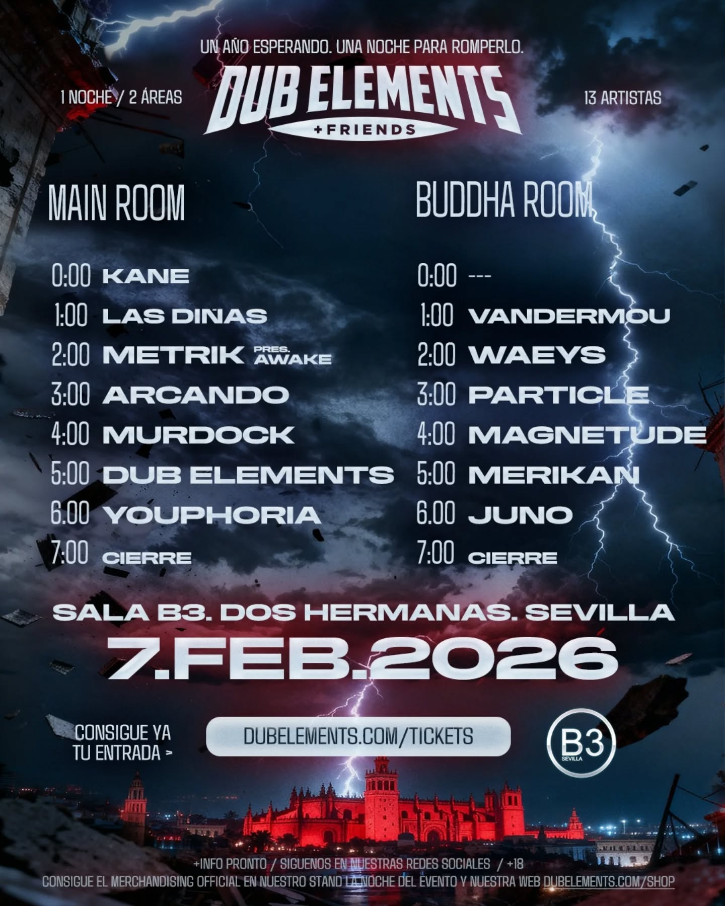¡El 9º Aniversario de Dub Elements & Friends ya está aquí! Con un LineUp donde aparecen figuras internacionales como Metrik, Arcando, Murdock, Waeys, Magnetude o Merikan, el dúo sevillano reúne a los aficionados en la Discoteca B3 de Dos Hermanas para convertir la localidad sevillana en la capital nacional del Drum & Bass más variado.