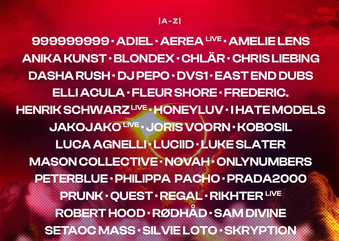 Anteriores artistas confirmados: DVS1, Prada2000, OnlyNumbers, Fleur Shore, Novah… / Chris Liebing, Dasha Rush, Luciid… / Robert Hood, Kobosil, Chlar… / Amelie Lens / Luca Agnelli, Henrik Schwarz, Dj Pepo…