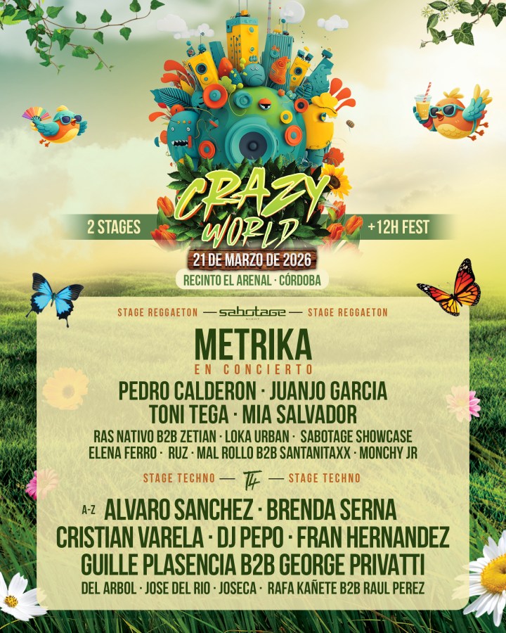 Vivimos tiempos muy locos, tiempos en los que disfrutar no es una opción, es una obligación. Por eso cuando necesitamos que se nos vaya la pinza, en el mejor sentido, tenemos que buscar un espacio que nos permita dar rienda suelta a nuestra locura. Y ese espacio sin duda alguna es el festival Crazy World. Una marca que no para de consolidarse y que vuelve a la carga el próximo 21 de marzo en El Arenal de Córdoba con dos escenarios en los que podrás disfrutar de diferentes estilos musicales.