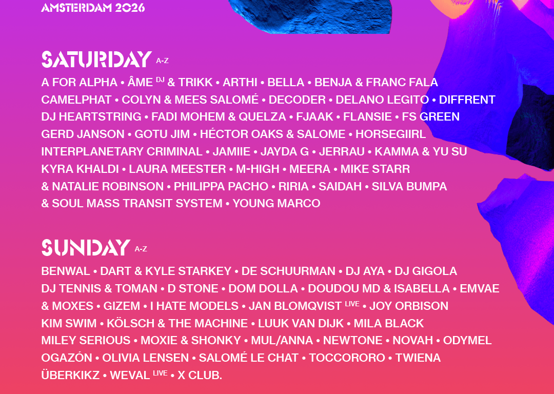 Twiena y Riria, dos estrellas emergentes de Ámsterdam y Londres/Tokio, aportarán energía fresca. Los sets rave y sin género de Twiena y la mezcla juguetona de club global y amapiano de Riria prometen momentos inolvidables. Completando el programa diurno —y uno de los grandes atractivos para el público neerlandés e internacional— estará el DJ de Groningen Benwal, junto a Dom Dolla, I Hate Models, Odymel, Luuk van Dijk y Weval (live), ofreciendo potentes sets y directos eclécticos. La noche del domingo será uno de los grandes momentos para los noctámbulos con Avalon Emerson & Ineffekt, Emvae & Moxes y Patrick Mason, aportando profundidad con techno hipnótico, house y grooves electrónicos.