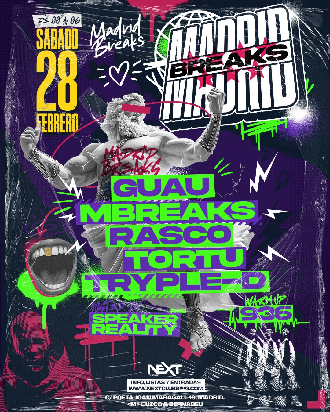 Por último disfrutaremos del talento de 936, DJ, productor y promotor (Intenso Club) español conocido por su enfoque energético y basado en los ritmos rotos. Su sonido fusiona elementos de UK Garage, Breaks, Drum and Bass y electrónica contemporánea con una sensibilidad por los bajos potentes. Ha actuado en Londres, Estados Unidos, Japón y ciudades de España, destacando por sets intensos, dinámicos y llenos de carácter propio. Acumula energía, carga las baterías, ponte en forma, porque el sábado 28 de febrero en la sala NEXT no habrá excusas para darlo todo, para dejar hasta la última gota de sudor electrónico en la pista de baile. Y recuerda, Madrid Breaks no deja supervivientes.