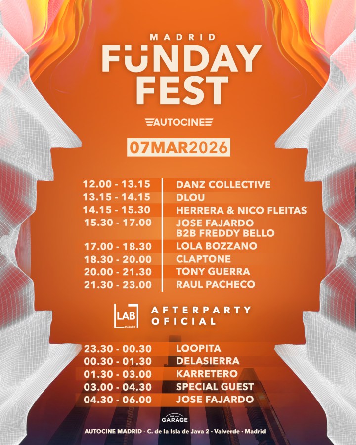 Fünday ha confirmado los horarios oficiales para su doble cita el sábado 7 de marzo, comenzando en The Lenovo Garage en horario diurno desde las 12.00 de la mañana para continuar en LAB Club a partir de las 23.30, dos espacios próximos entre sí que ofrecerán más de dieciocho horas seguidas el próximo sábado.