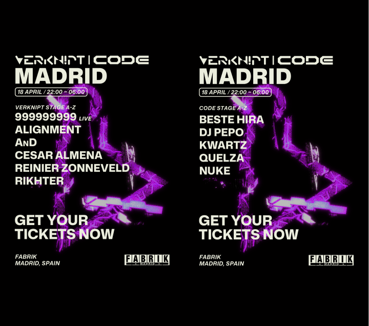 Cuando una primera edición roza el sobresaliente, el siguiente paso es inevitable. Así lo han entendido CODE y Verknipt que, tras el éxito de su primera colaboración en la noche de Halloween de 2025, regresan con un segundo capítulo que introduce cambios sustanciales. La unión entre una de las grandes potencias del techno y uno de los referentes del hard techno vuelve a materializarse en FABRIK. Tras conquistar el Area 19 en su debut conjunto, esta nueva entrega da el salto a la Main Room y a la Satélite. Esto supondrá que la marca holandesa pueda desarrollar todo su potencial en la imponente sala principal del club madrileño. Atención a lo que puede salir de aquí.