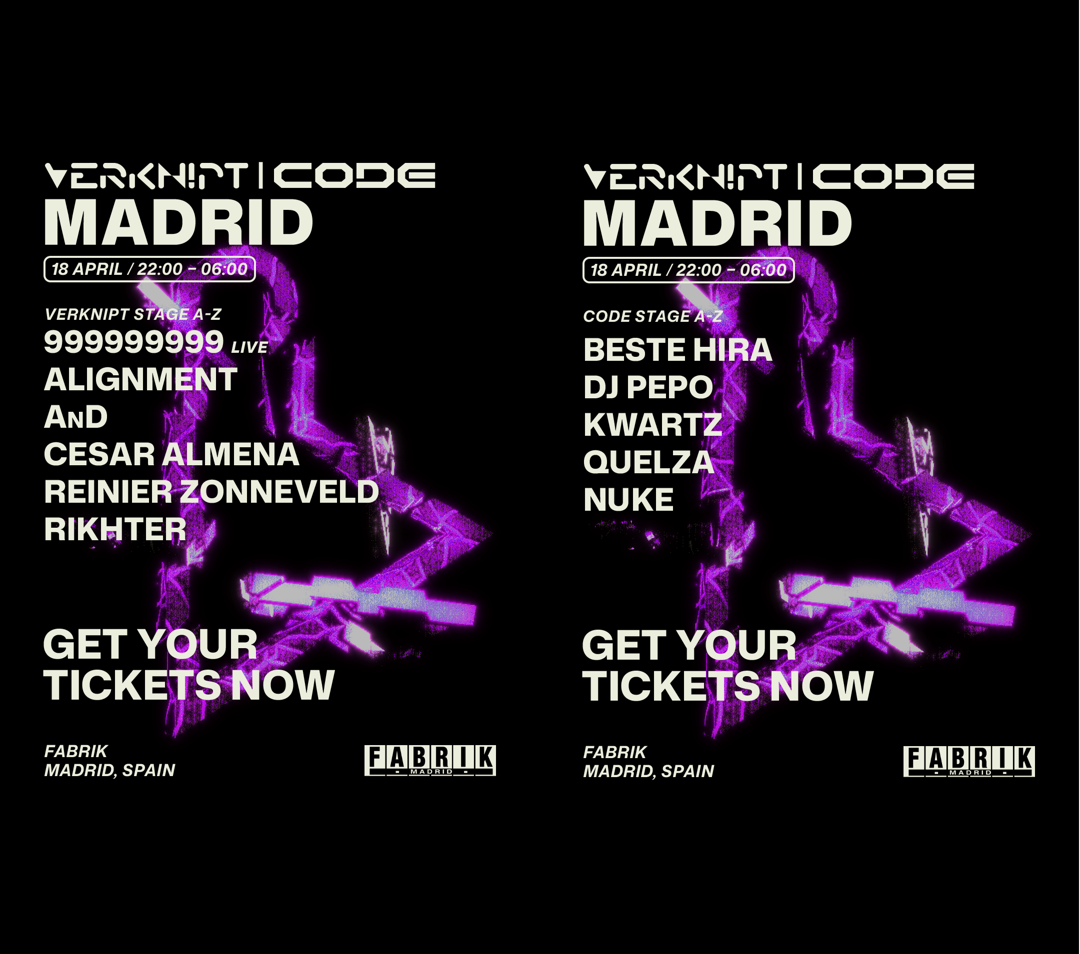 Como novedad, CODE contará con un stage propio en la sala Satélite, reforzando el carácter de la colaboración. Este espacio acogerá el sonido más reconocible de la marca madrileña, desde el groove hipnótico de Beste Hira hasta el techno profundo de Quelza y Kwartz, pasando por la precisión de Nuke y culminando con el cierre de DJ Pepo, conocido por sus closings de alto voltaje. Un evento de estas características exige una producción a la altura, y FABRIK cumplirá. La respuesta estará en la pista de baile el próximo 18 de abril: