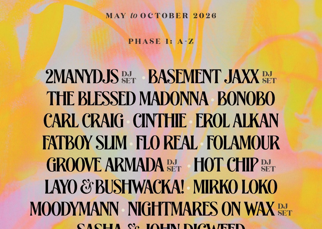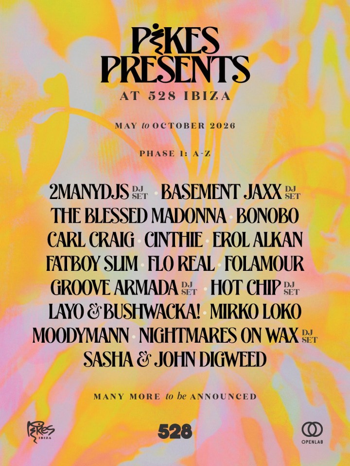 2Manydjs, Basement Jaxx (DJ Set), Bonobo (DJ Set), Carl Craig, Cinthie, Erol Alkan, Fatboy Slim, Flo Real, Folamour, Groove Armada (DJ Set), Hot Chip (DJ Set), Layo & Bushwacka!, Mirko Loko, Moodymann, Nightmares On Wax (DJ Set), Sasha & John Digweed y The Blessed Madonna son los primeros artistas confirmados en Pikes Presents 2026, a los que sumarán otros muchos nombres que se anunciarán próximamente.