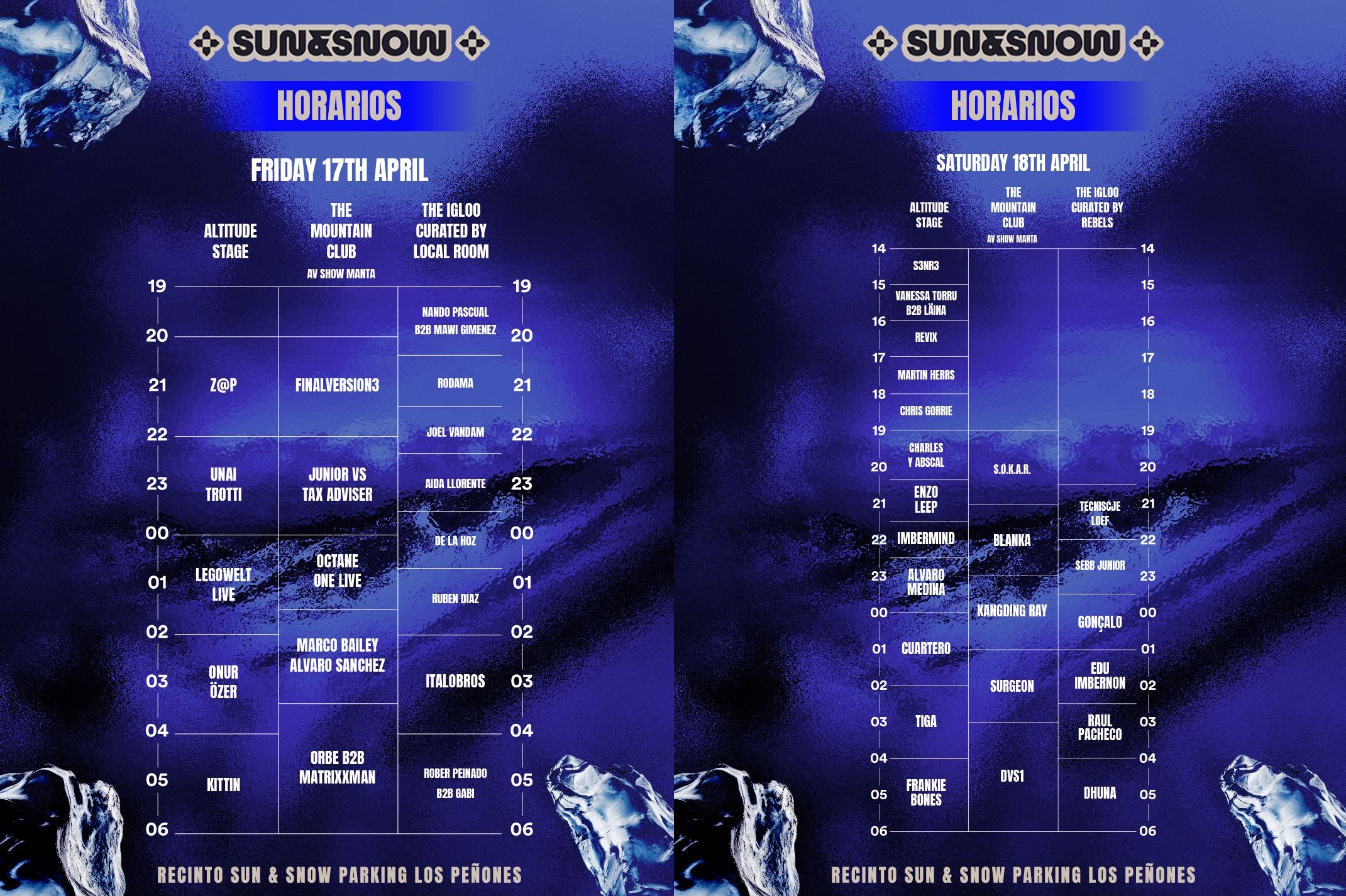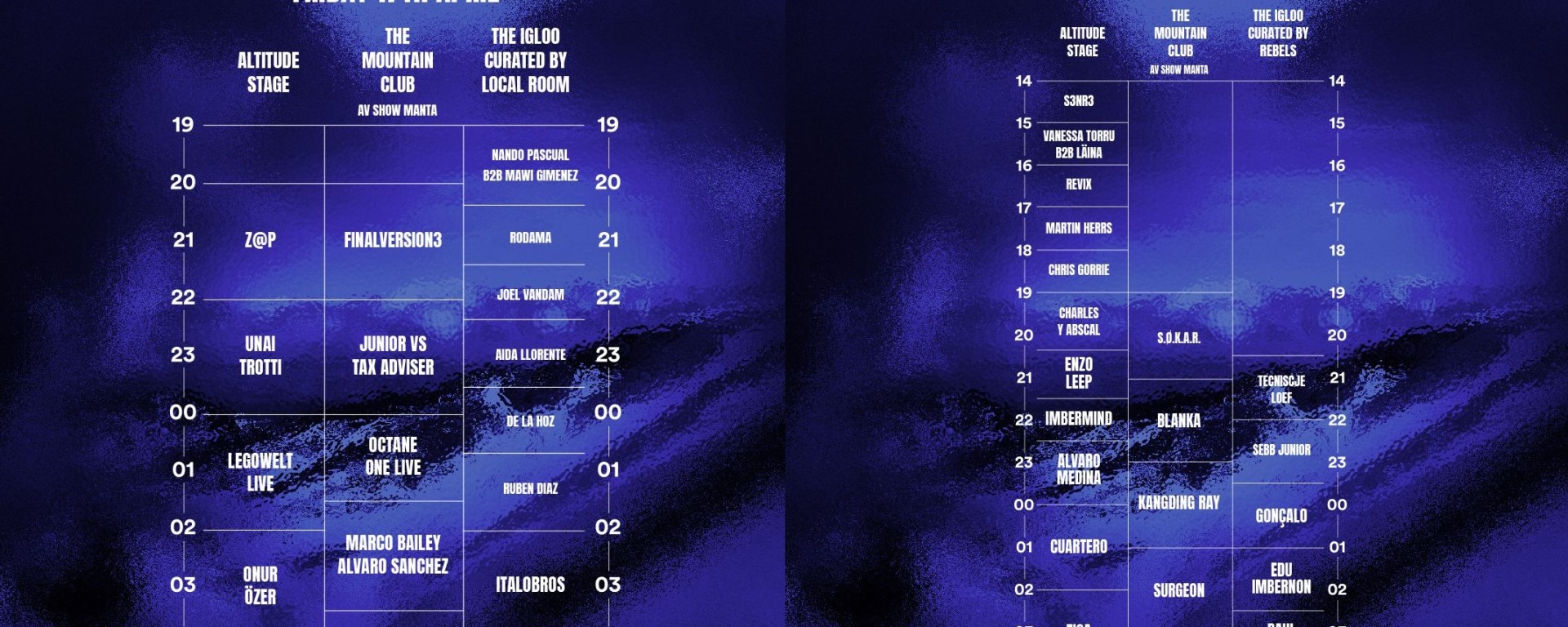 El festival comenzará en el espacio The Igloo Curated by Local Room a las 19:00 con Nando b2b Mawi, a las 20:15 será el turno de Amador, a las 21:15 tendremos a Joel, a las 22:15 será el turno de Aida Llorente, a las 23:30 se subirá a la cabina De la Hoz, a las 00:45 actuará Rubén, a las 02:00 bailaremos con Italobros, y cerrarán la noche a las 04:00 Rober b2b Gabi.