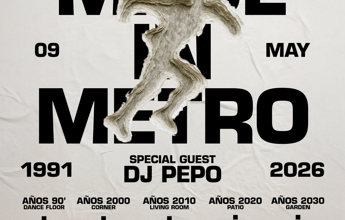 El próximo 9 de mayo de 2026, Metro te invita a un acto de memoria y de proyección. No solo para revivir momentos pasados, sino para ponerlos al servicio del presente. Y para ello nos presentan un cartel simplemente único e irrepetible. En el Dance Floor los años 90 se hacen presentes con Techno clásico, Trance, Acid House, Máquina. Una selección de los hits más emblemáticos que marcaron la fundación de Metro, incluyendo también una sesión de apertura con pop noventero, guitarras y vocales melódicas. Esta sala busca provocar nostalgia, reconocimiento y energía positiva. Y quién mejor para llevarlo a cabo que tres artistas como Justo, Martin, Kuki y Paco García