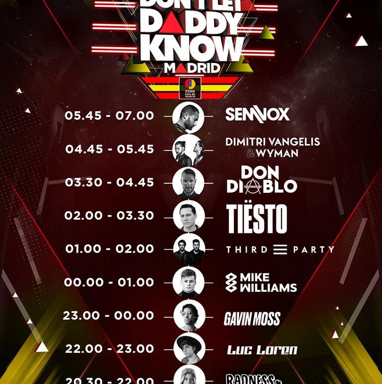 El próximo sábado llegará a Madrid al fin un festival muy esperado por muchos. Don’t Let Daddy Know regalará una increíble noche a todos los amantes de la electrónica, los cuales ya pueden conocer los horarios para tal ocasión. La organización también ha publicado información muy importante y de interés para los asistentes, la cual podéis ver aquí: El festival que tendrá lugar … Continúa leyendo Horarios e información esencial para DLDK Madrid