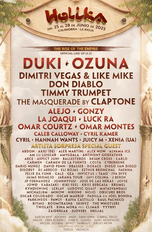 Esta semana toca celebrar uno de los festivales españoles más importantes de la década de los 2020. HOLIKA regresa a la acción en Calahorra (La Rioja) con un cartel lleno de estrellas de diferentes géneros como el EDM-House, Mainstream y Hard (Dimitri Vegas & Like Mike, Don Diablo, Timmy Trumpet, Juicy M, Brian Cross, Parkineos, Joyse, The Whistles …), House y Techno (The Masquerade by Claptone, Xenia, … Continúa leyendo Horarios Holika Festival 2025