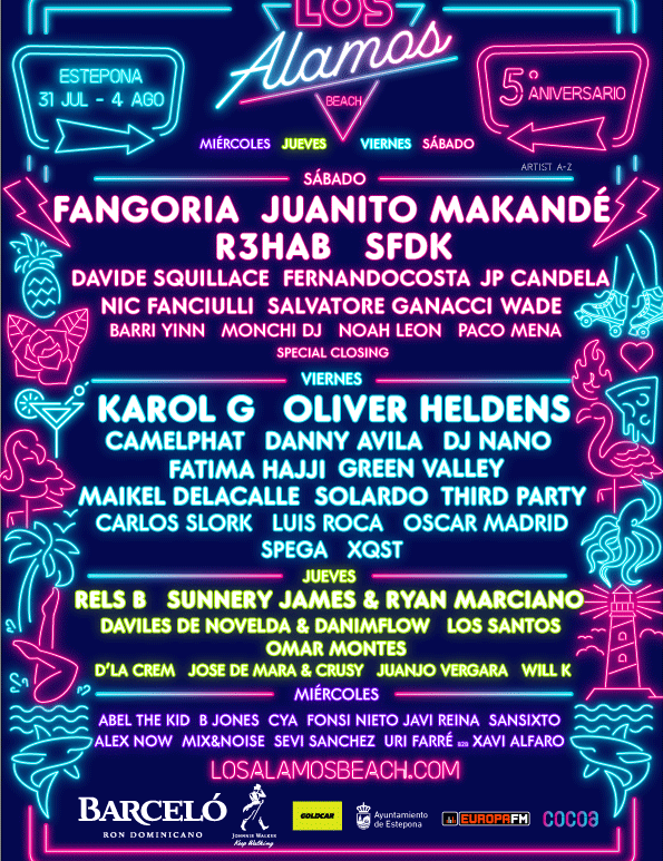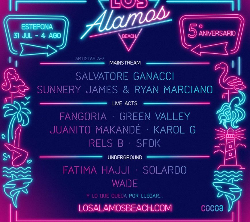 Andalucía se prepara para recibir este fin de semana a uno de sus mayores festivales del verano. Los Álamos Beach Festival hará que por segundo año consecutivo la ciudad malagueña de Estepona acapare todas las miradas en un evento cargado de variada música. La electrónica volverá a ser la gran protagonista con grandes actuaciones internacionales a las que en los últimos días se han sumado … Continúa leyendo Cartel completo y horarios Los Álamos 2019